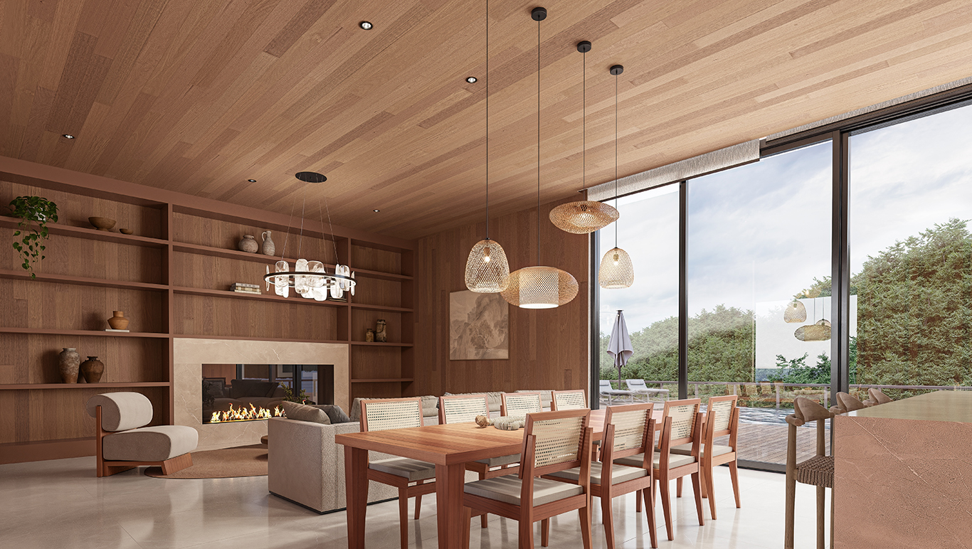 Intensidade e charme! O forro Jequitibá Cinnamon exibe a beleza marcante da madeira natural com tons quentes e avermelhados, envolvendo os ambientes do chão ao teto. Sua coloração rica e acolhedora valoriza composições sofisticadas e cheias de personalidade.